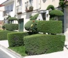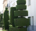 Working on bases of evergreen cypress, yew, boxwood, and other plants that grow densely and respond well to ornamental shaping, Domínguez eventually sculpted the bushes into the forms of animals, birds, baskets, ceramic vessels, crowns, and geometric shapes including cones, balls, pyramids, squares, spirals, triangles, and obelisks. He used simple garden shears to slowly form the shapes and a simple hand-mower to cut the grass. He added interior armatures to support the works with greater surfaces so as to help them withstand the windy gusts roaring down from the mountains or from across the plains. Coaxing the bushes and trees to grow into his designs was a long-term process: just to develop the basic form took him two to five years, and continuing to guide the branches and needles into the fully-fleshed out design required consistent trimming, a minimum of three times per year. Dodging street intersections, sidewalks, streetlights, and driveways, he seems to have formed and placed discrete images subject only to his inspiration: the shapes appear rather randomly—although not unpleasantly—situated, almost like a procession of individuals, rather than as a connected arrangement of related objects. They vary seemingly arbitrarily in height, width, and subject, although there are, on occasion, pairs of symmetrical installations on either side of a sidewalk, driveway, or section of public commons. He ultimately created over 150 forms stretched out over more than eight-tenths of a mile lining both sides of the main street through town.