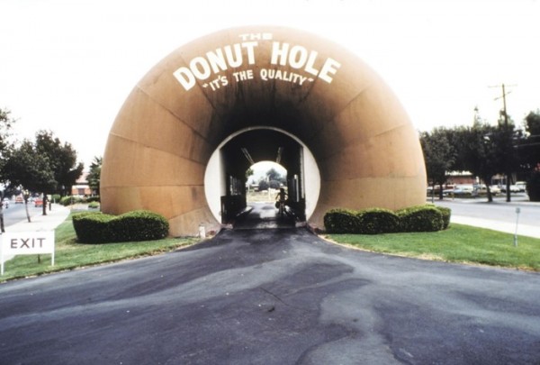 "Designed by an unknown genius person, the shop is a wood-and-stucco one-story commercial building split into two halves with a driveway in the middle, bracketed at each end by an enormous fiberglass donut. The driveway allows customers to drive right through the center to place and pick up their orders, and the donuts obviously serve to advertise the shop’s product while delighting all who pass by.